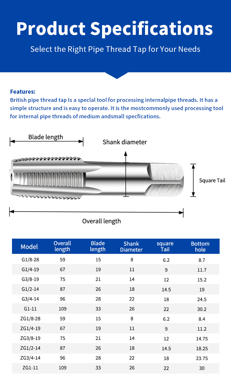 Anwendungsbereiche: Geeignet für Gewindeschneidmaschinen, Bearbeitungszentren, Fräsmaschinen, Tischbohrmaschinen, CNC-Werkzeugmaschinen usw. Rohrgewindebohrer werden in Branchen wie der Fertigungsindustrie und der Möbelindustrie häufig eingesetzt und sind in verschiedenen Bereichen beliebt.